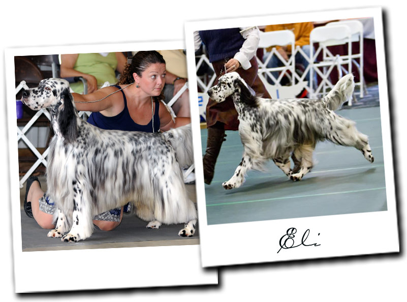 Eli is a beautiful blue belton who is an OFFA Chic dog (OFFA hips good, normal elbows and BAER clear) who also produces tri-color. Eli puts bone, pretty heads and great toplines on his puppies. He is an all-breed High In Trial dog and finished in the top ten of all sporting dogs in Novice B and Open A. Eli was also the 2010 ESAA dog of the year.